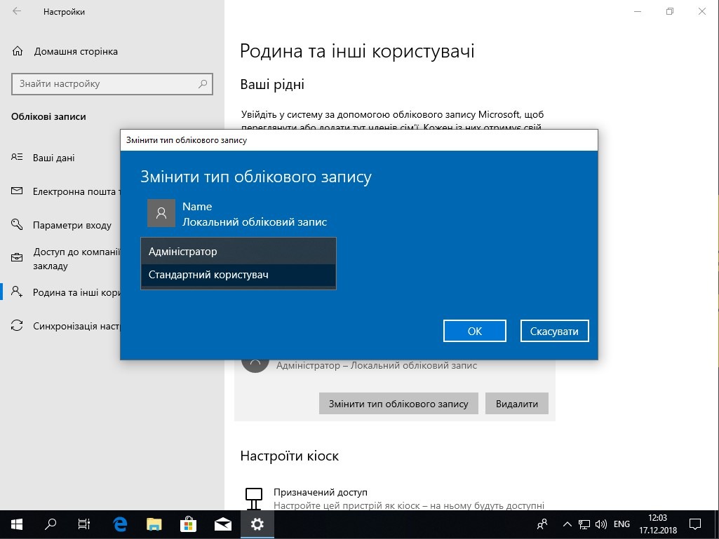 Далі необхідно змінити наш обліковий запис (у нашому випадку це Name), в якому ми звикли працювати, та понизити права до Стандартного користувача. Для цього виберіть «Родина та інші користувачі» в налаштуваннях «Облікові записи».